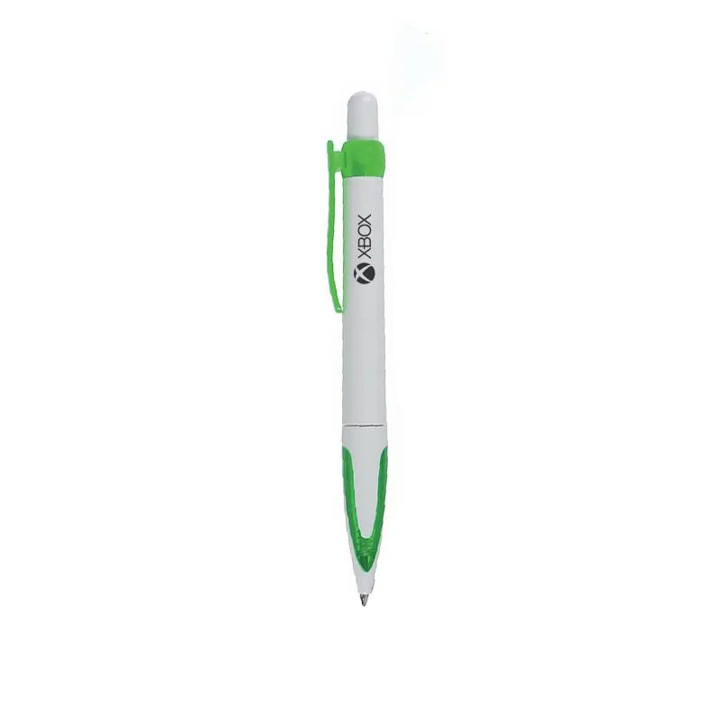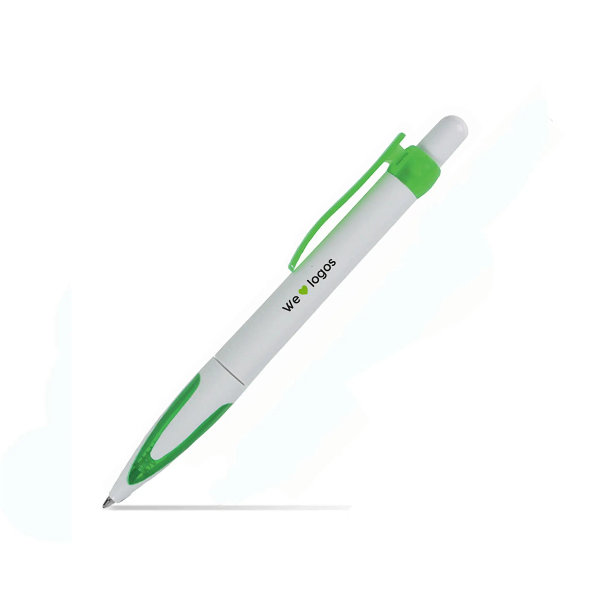 Bolígrafo plástico de cuerpo blanco con clip y grip en colores con transparencia. Apertura con pulsador. Tinta Negra 700 m de longitud de escritura.