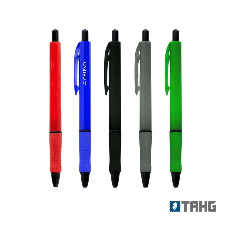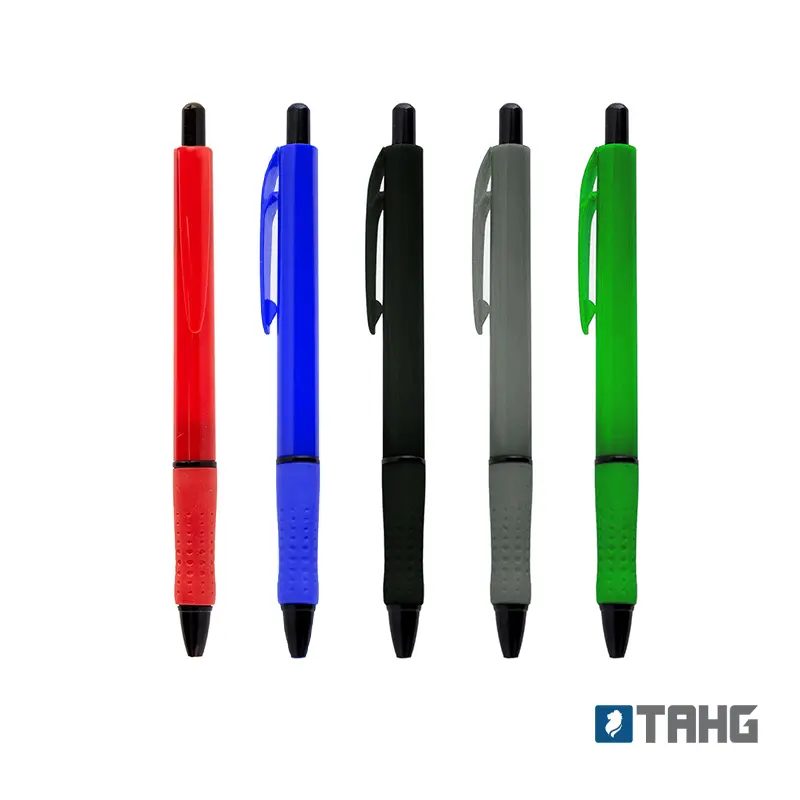 Bolígrafo con cuerpo plástico de color. Grip de goma combinado con el cuerpo. Pulsador negro. Retráctil. Tinta negra. Tahg