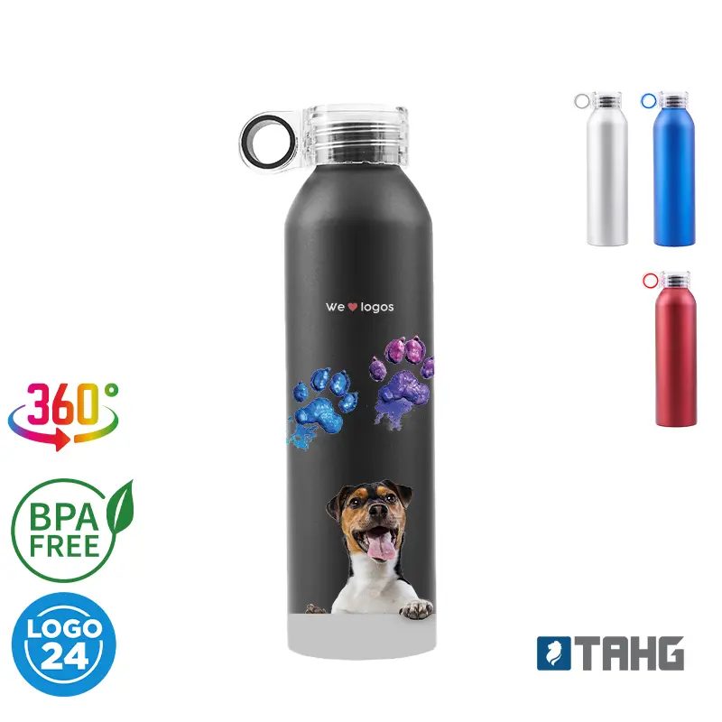 Sport Bottle reutilizable de aluminio con tapa rosca de PP, y anillo circular de agarre. Producto libre de BPA. Producto aprobado por el I.N.A.L. para el contacto con alimentos. Medidas: 23 cm x 6,6 cm. Capacidad: 660 ml. Tahg.