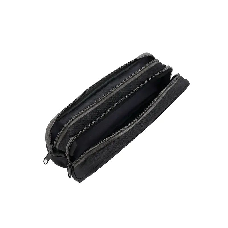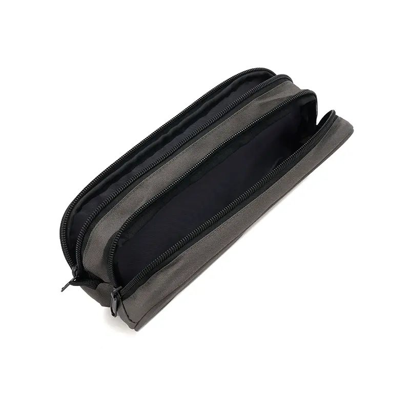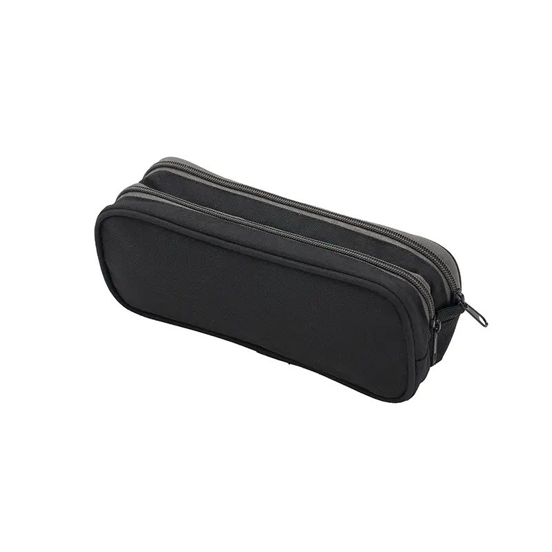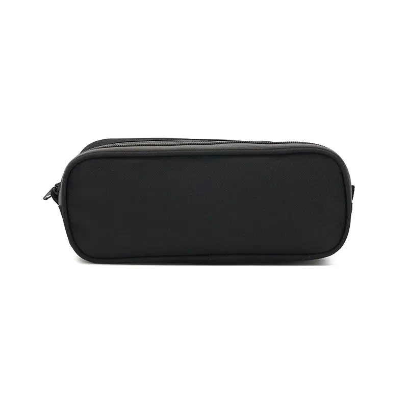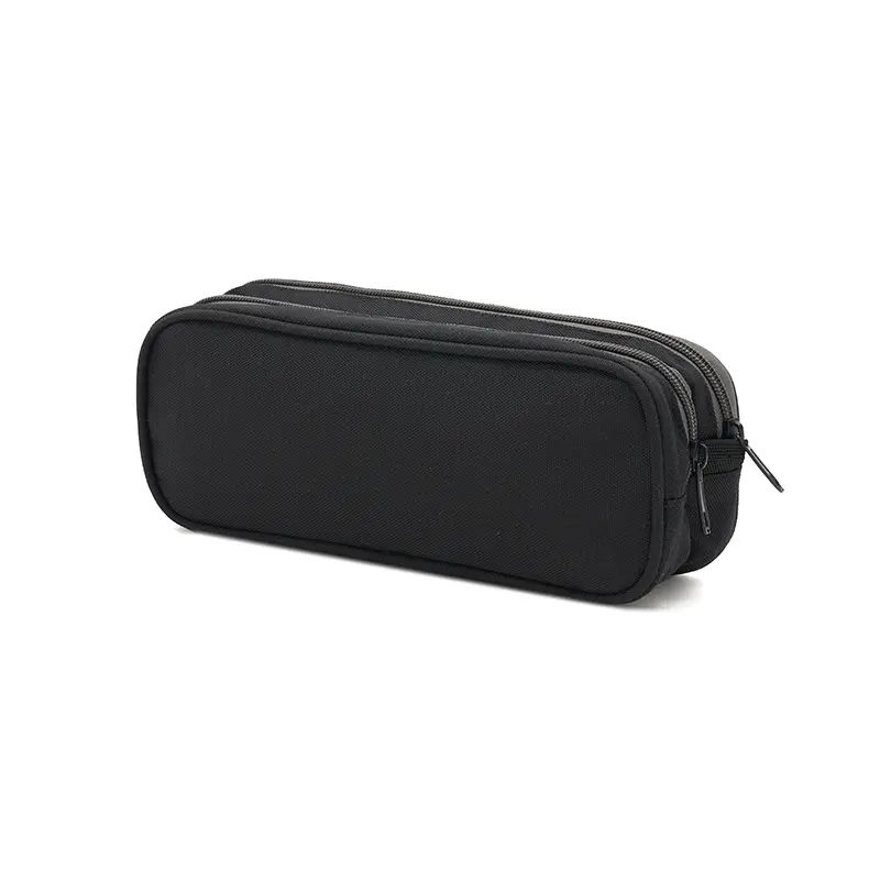 Cartuchera fabricada con un exterior de nylon gucci. Cuenta con dos compartimentos con cierres de colores contrastantes y un forro interior completo de 210D. Los colores disponibles son negro y gris. Medidas: 25 x 10 x 6 cm. Ideal para organizar útiles escolares o artículos personales, ofreciendo estilo y funcionalidad en un diseño compacto. El producto viene en una bolsa hecha de material 100% PLA, biodegradable y compostable. Tahg