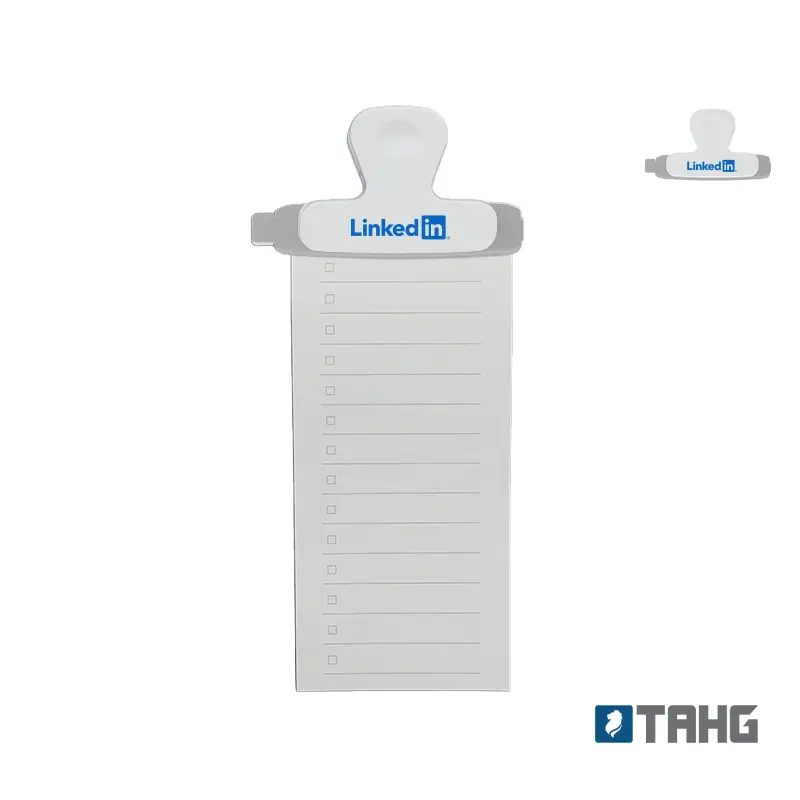 Clip magnético blanco y gris. Hecho de poliestireno (PS) y magneto. Cuenta con diseño ergonómico con imán trasero, pinza de agarre firme y superficie plana con detalles en gris. Es ideal para sujetar papeles, cerrar bolsas o adherirse al refrigerador para dejar recordatorios o notas.