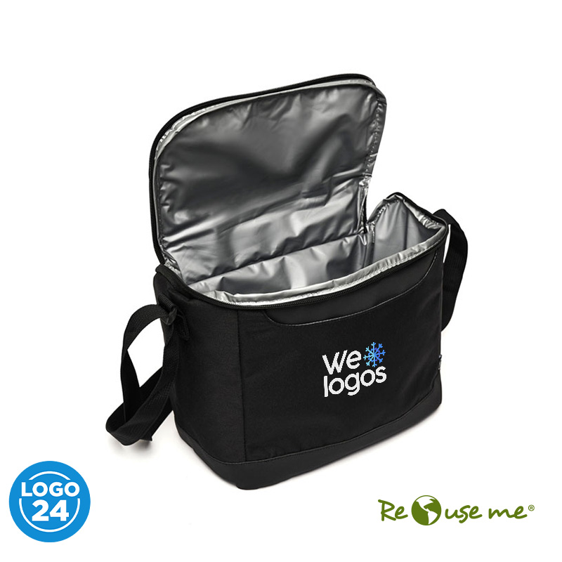 Cooler confeccionado en poliuretano, poliéster con revestimiento de PVC, espuma de polietileno 3mm utilizada como aislante y PEVA Lining, un revestimiento de polietileno vinil acetato, conocido por ser impermeable y usado en recubrimientos.