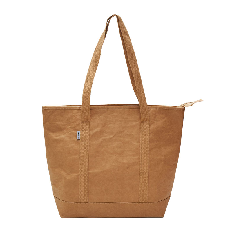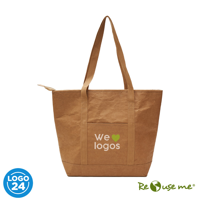 Cooler con formato tipo cartera. Realizado en su exterior en papel kraft, con interior térmico de PEVA. Medidas: 30,5 x 12 x 34 cm. Capacidad: 12L. ReUseMe.