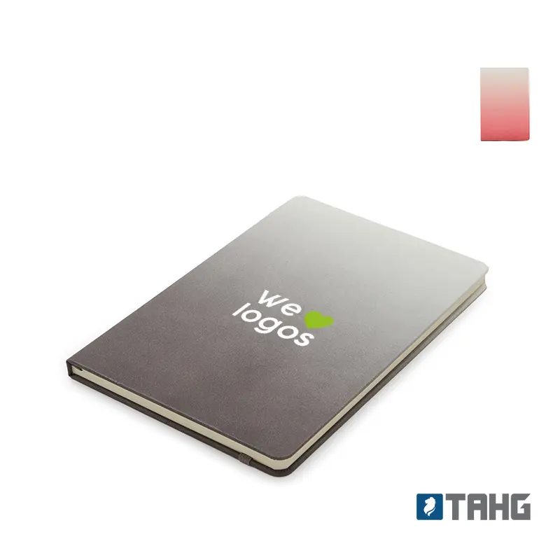 Cuaderno con tapa de efecto de color graduado. Cuenta con 80 hojas rayadas color marfil, de 70 gramos cada una. Posee una cinta separadora de color a tono y elástico para cerrarlo.