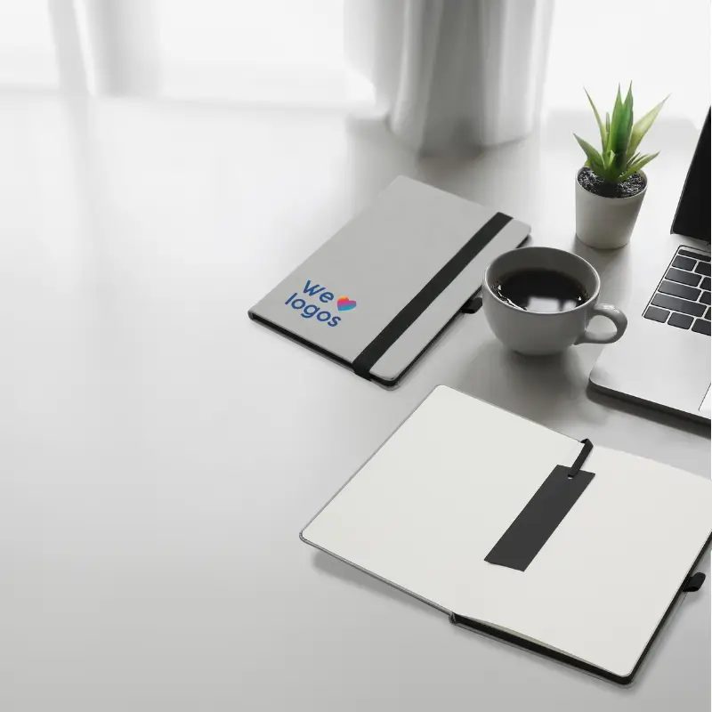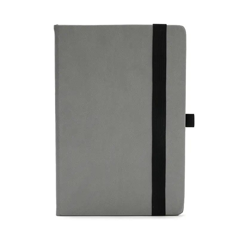 Cuaderno con tapa dura confeccionada en PU (poliuretano) color gris. Cuenta con 96 hojas rayadas de 70 g, perfectas para tomar notas, escribir ideas o planificar la jornada e incluye cinta señaladora.