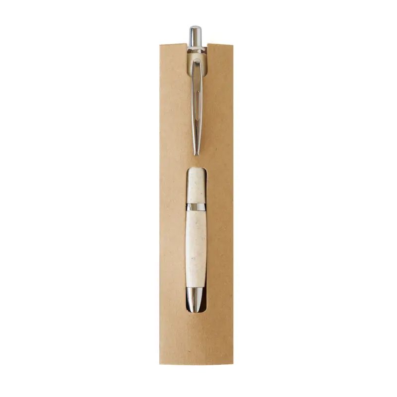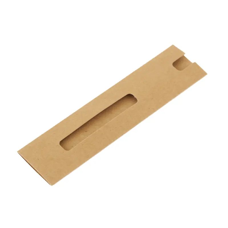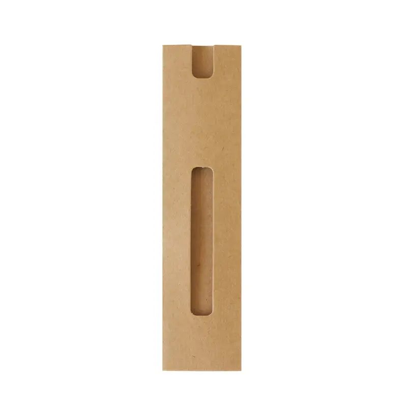 Estuche sencillo y ecológico para presentar bolígrafos. Fabricado con papel kraft resistente. Cuenta con una ranura central que facilita colocar y exhibir el bolígrafo de forma segura y un diseño plegable que protege el contenido. Es ideal para complementar regalos corporativos o como empaque de presentación.