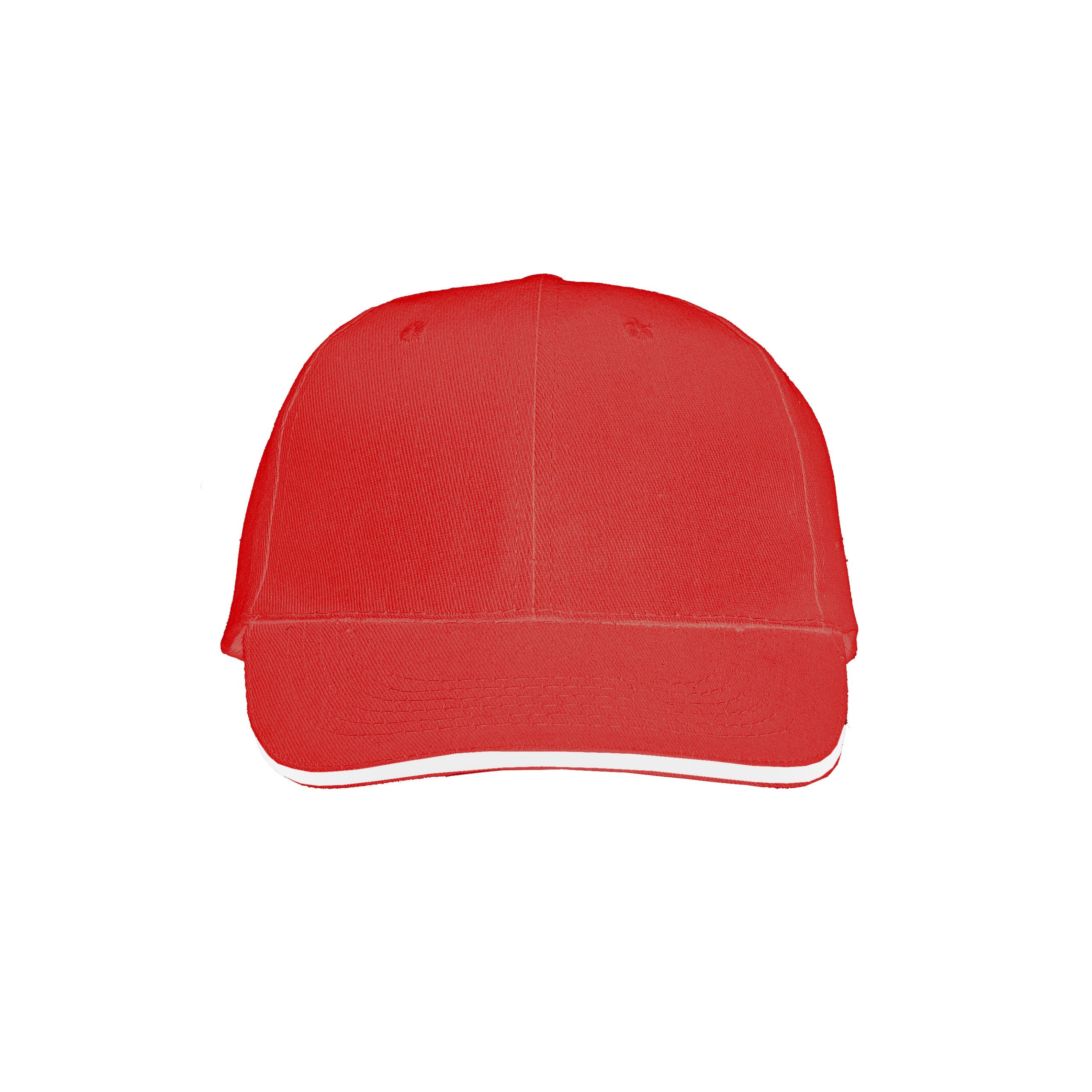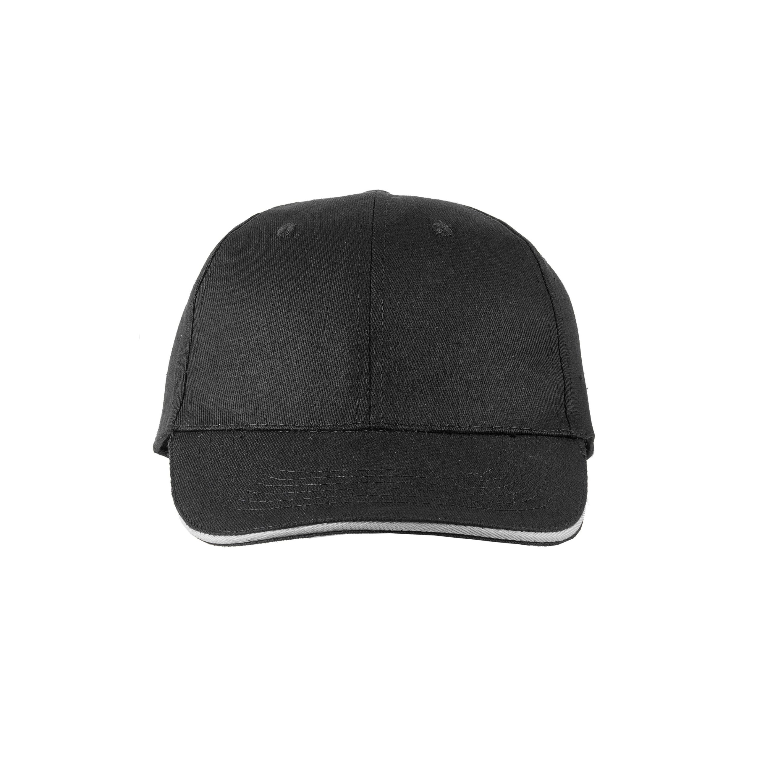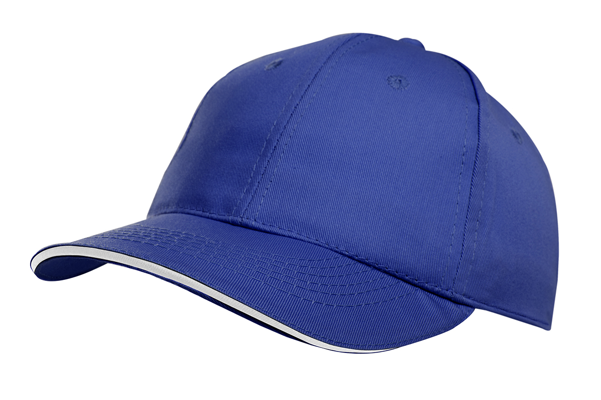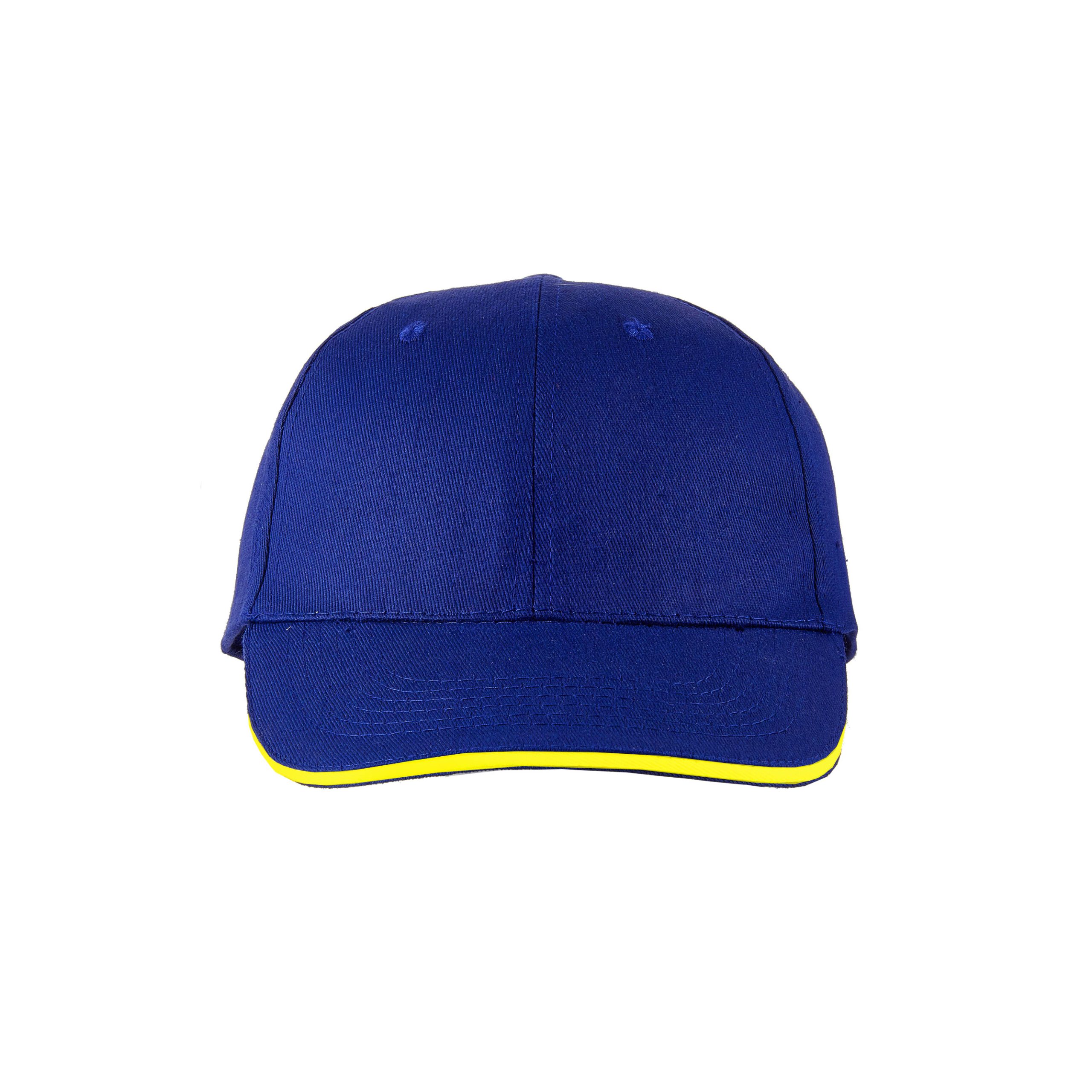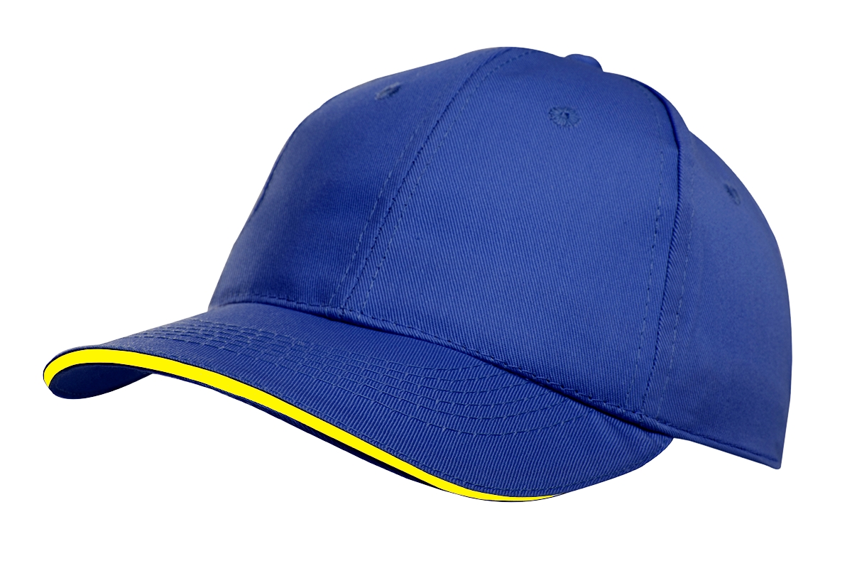 Gorro de gabardina de 6 paneles, con vicera tipo sandwich en colores combinados, y cierre con velcro. Material: 100% algodón.
