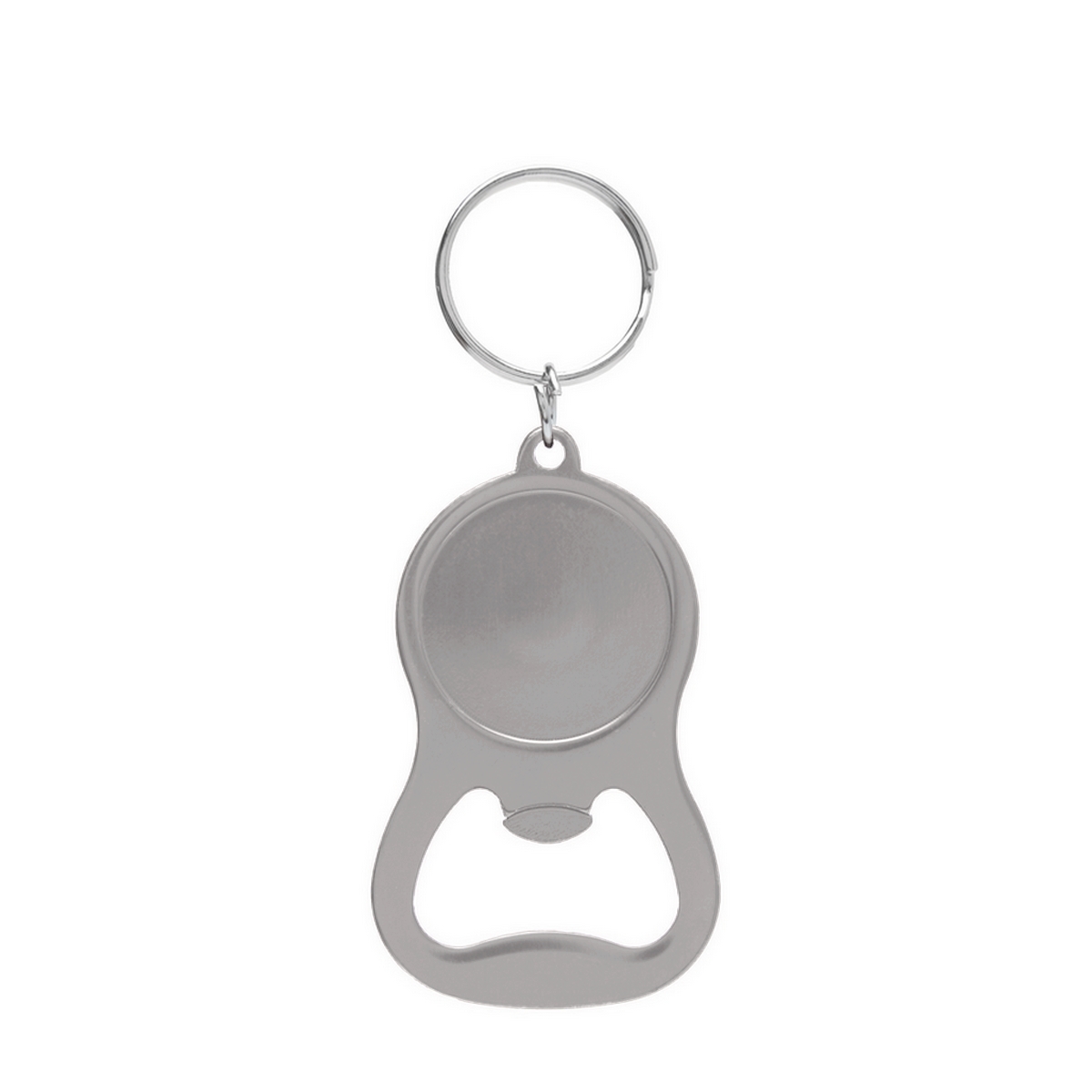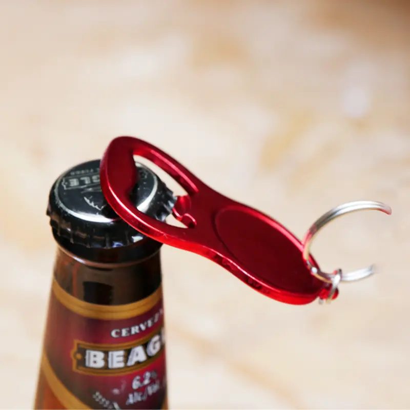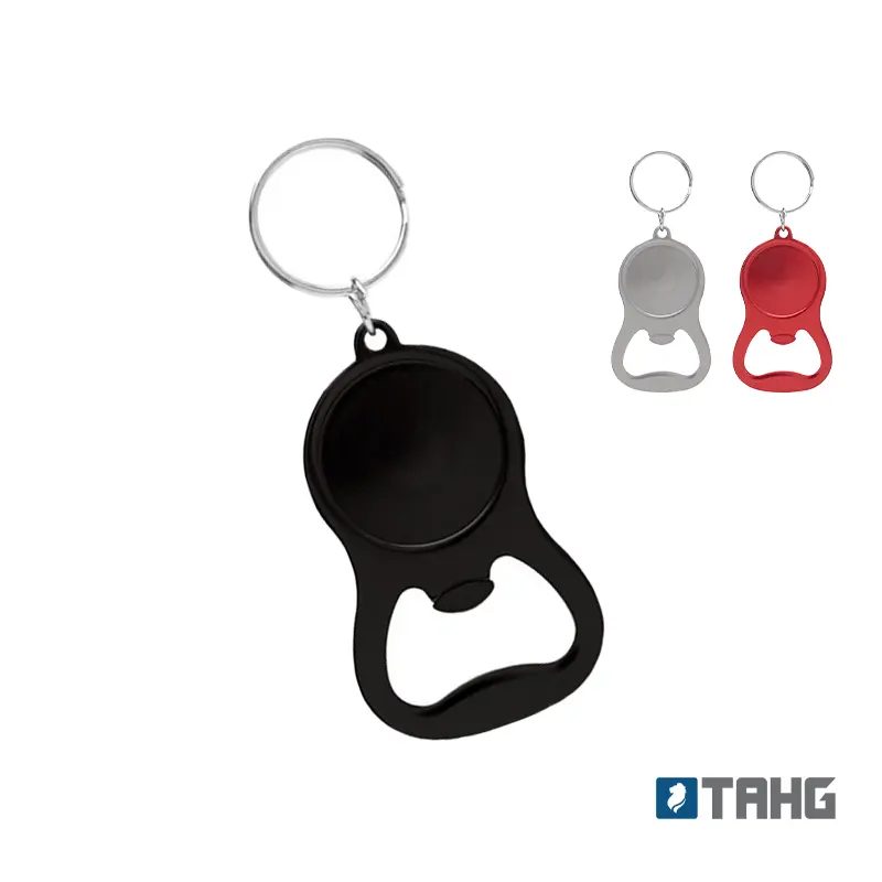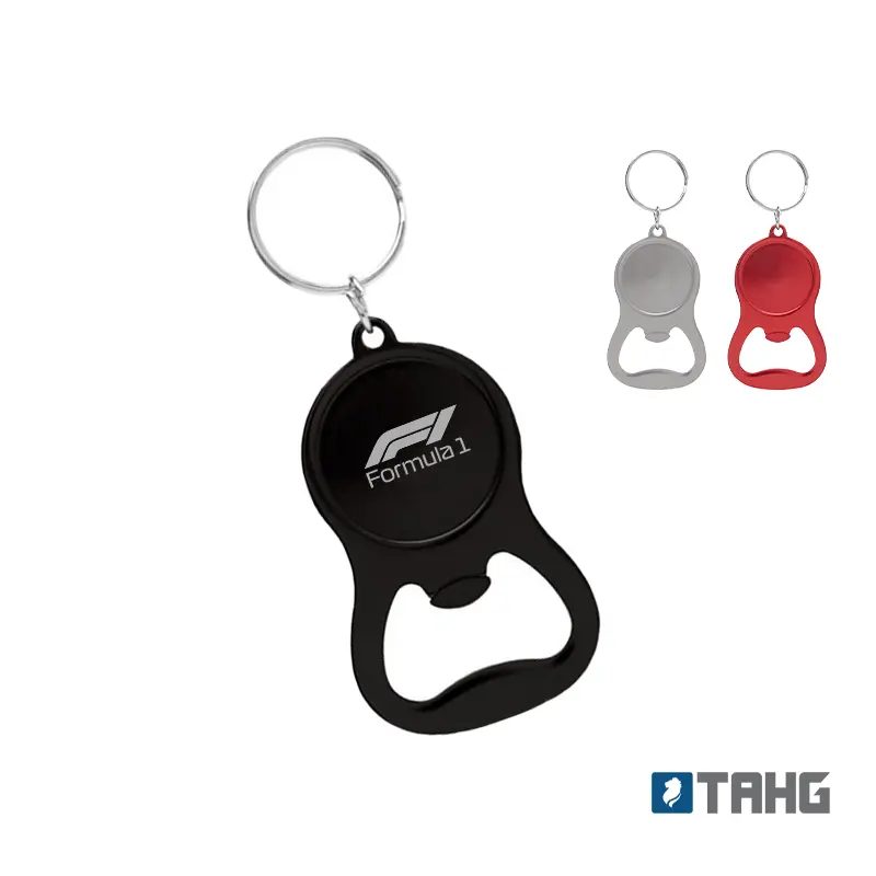 Llavero abridor tapa corona, metálico. Medidas: 4 x 6,5 x 0,3 cm. (anillo de 25 mm de diámetro). Tahg
