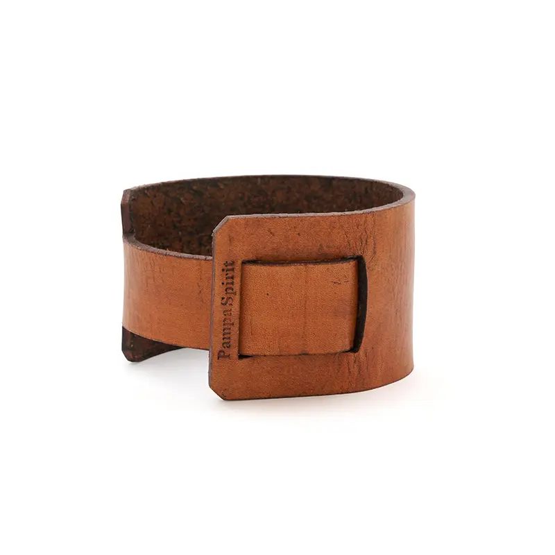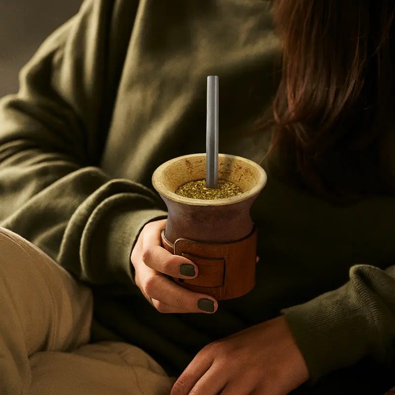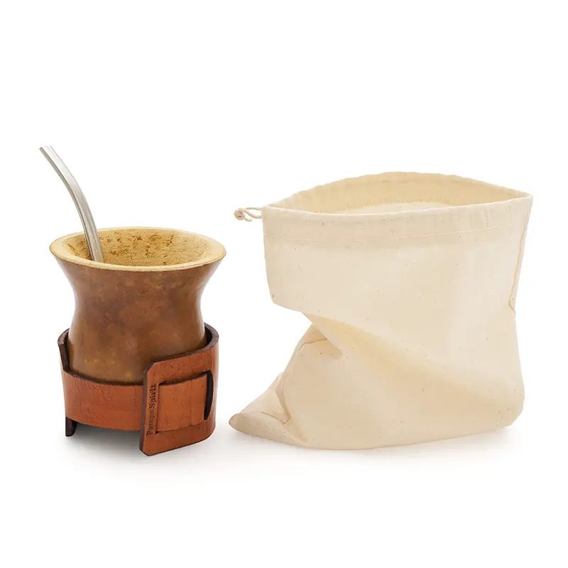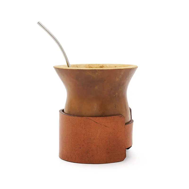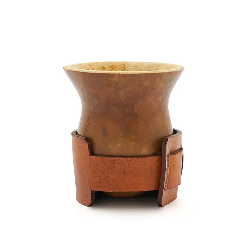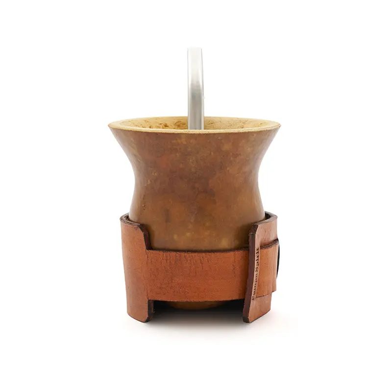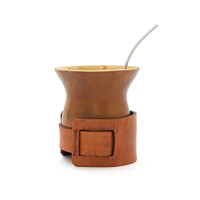 Mate de calabaza natural seleccionada y pulida, montada sobre un cinturón regulable de cuero vaqueta vacuno. Su base de cuero brinda firmeza, y su capacidad lo hace ideal para disfrutar largas rondas de mate en cualquier entorno. Incluye bombilla de acero inoxidable con resorte y una bolsa de algodón de 20 x 20cm.