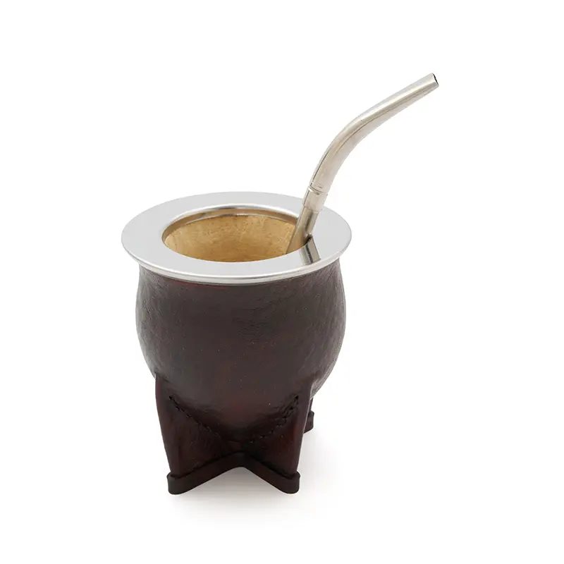Mate de calabaza tipo camionero moldeado en cuero vacuno con aro de acero inoxidable pulido espejo. Es ideal para uso diario, campañas institucionales o packs promocionales. Incluye bombilla pico de loro y una bolsa de algodón de 20 x 20cm.