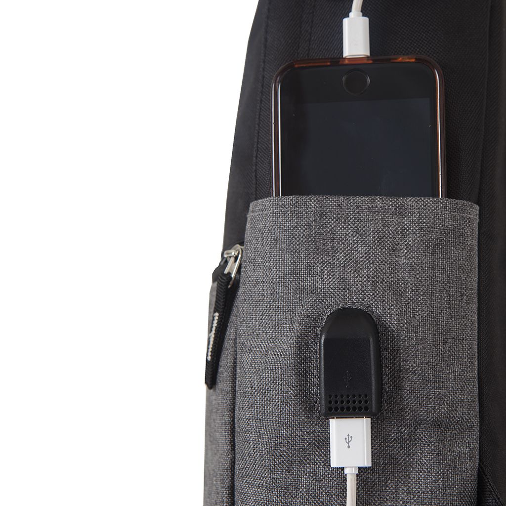 Mochila con puerto USB y compartimiento Principal Portanotebook, Realizada en Polyester 600D + Polycanvas. Cuenta con bolsillo frontal con cierre y bolsillos laterales. Medidas: 44 x 12 x 27 cm. Capacidad: 14 Lts. Laptop: 15´.