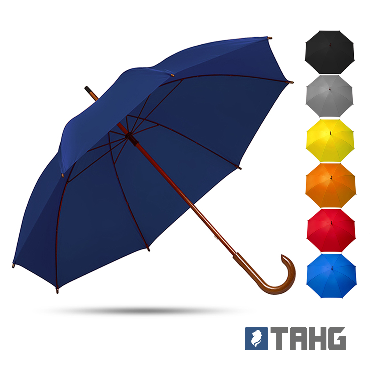 Paraguas de 8 gajos con mango de madera curvo. Sector plano en el mango para personalizar. Elaborado en Polyester. Medidas: Largo 89 cm x diámetro 100 cm. Material: Polyester 190T. Tahg.