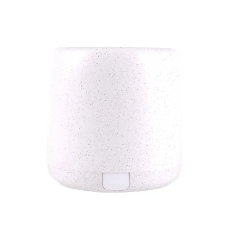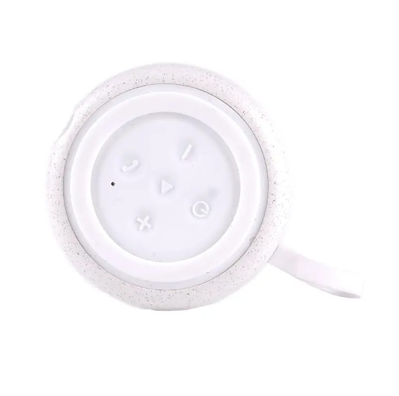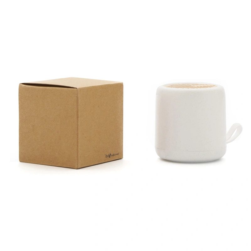 Parlante portátil fabricado en bambú y wheat straw, pasta de tallo de trigo, un material sustentable que reduce el consumo de plásticos vírgenes.
