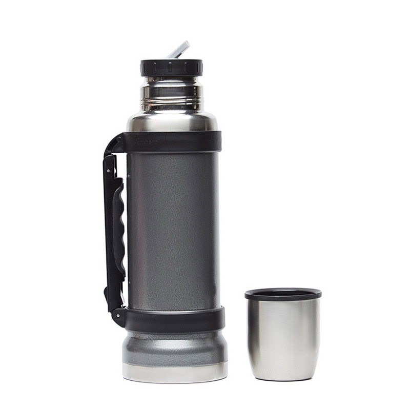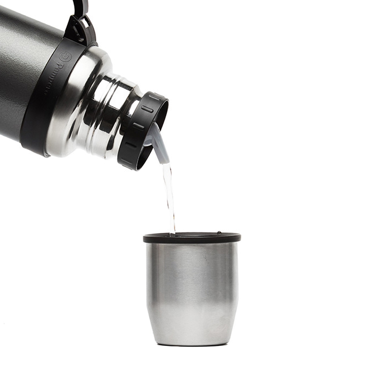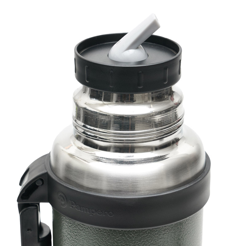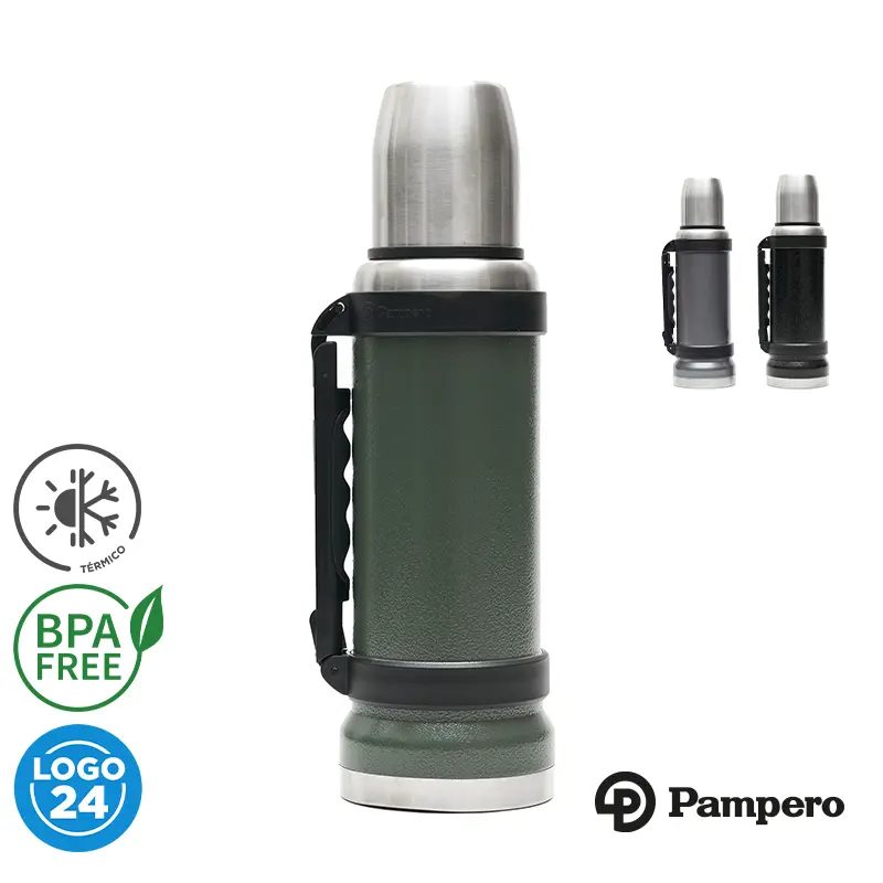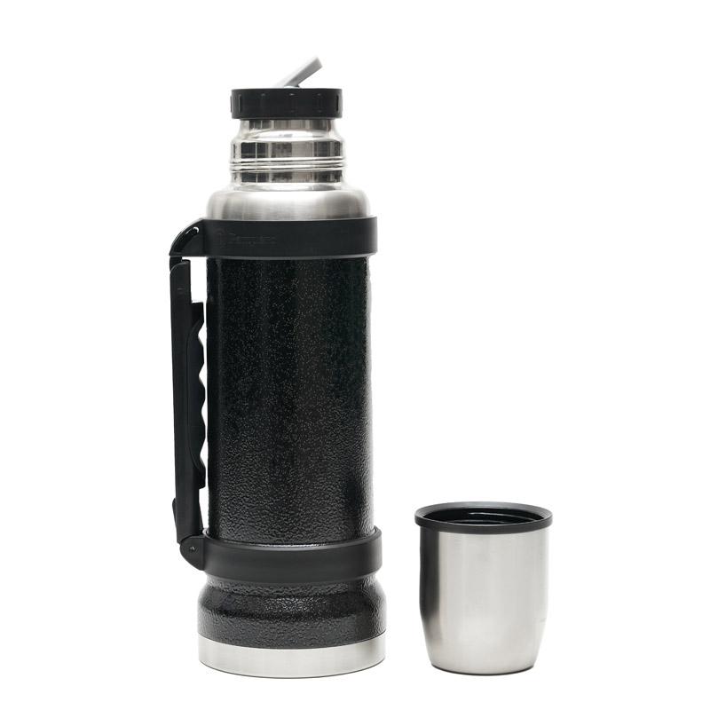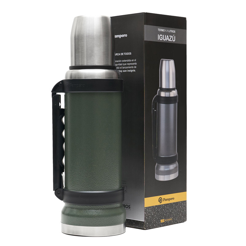 Termo de acero inoxidable 304, recubierto con esmalte especial que protege de ralladuras y golpes. Puede mantener el contenido a la misma temperatura durante 18hs, gracias a su doble pared aislante especial de acero. Cuenta con un tapón cebador Hermético a rosca con la función anti derrame y tapa con superficie plana estable para usar como taza o vaso y manija plegable para facilitar el transporte. Presentado en caja de cartón. Producto aprobado por el I.N.A.L. para el contacto con alimentos. Medidas del termo: 34 cm x 10,5 cm. Medidas de la caja: 35 x 11 x 11 cm. Capacidad: 1,1 Lts. Pampero.